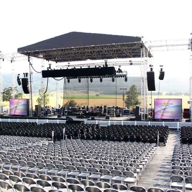 Panggung, Tenda, lighting, meja. kursi, AC, genset, dan sebagainya.